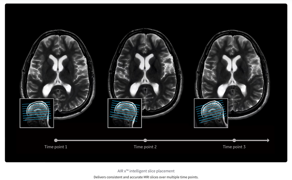 AIRx is a software tool that analyzes the three‑plane “localizer” scan taken at the very beginning of an MRI exam and then automatically chooses the MRI slices—thin, cross‑sectional pictures of the body—that an experienced technologist would normally set up by hand. The underlying deep-learning model powering AIRx was trained on tens of thousands of images, and detects patient anatomy with sufficient accuracy to hold slice-to-slice angular error below two degrees across neurological and knee protocols.