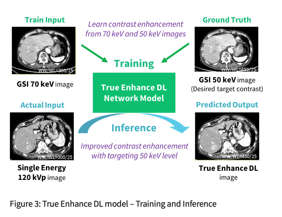 Dual‑energy CT scanners capture two separate X‑ray spectra—two distinct energy levels—at the same time. This twin‑beam method improves iodine contrast—an iodine‑based dye that makes blood vessels and tumors stand out on the scan—for tumor staging and vascular imaging. However, it still relies on specialized detectors and high‑voltage generators that remain expensive. True Enhance DL circumvents that barrier by using a dedicated neural network to transform single-energy projection data into virtual 50 keV monochromatic images, thereby mimicking the visual impact of dual-energy acquisitions without exposing them to unnecessary additional radiation or hardware.