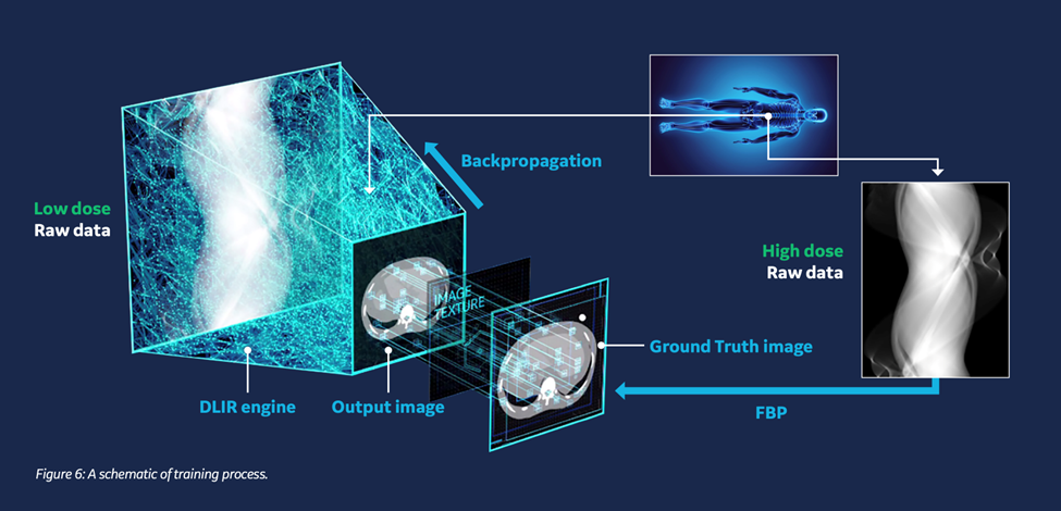 GE HealthCare’s True Fidelity deep-learning image-reconstruction engine was the first CT algorithm of its kind to receive U.S. FDA 510(k) clearance in November 2019. Trained on matched pairs of high‑ and ultra‑low‑dose scans, the network recognizes quantum noise—random speckles that appear when too few X‑ray photons are recorded—and removes it while preserving natural edge detail and image texture. A technical white paper summarizing subsequent multi-center studies reports dose reductions of up to 82 percent with either maintained or improved low-contrast detectability. Children, trauma victims, and oncology patients who require frequent imaging therefore receive diagnostically robust scans with a fraction of the radiation exposure historically required.