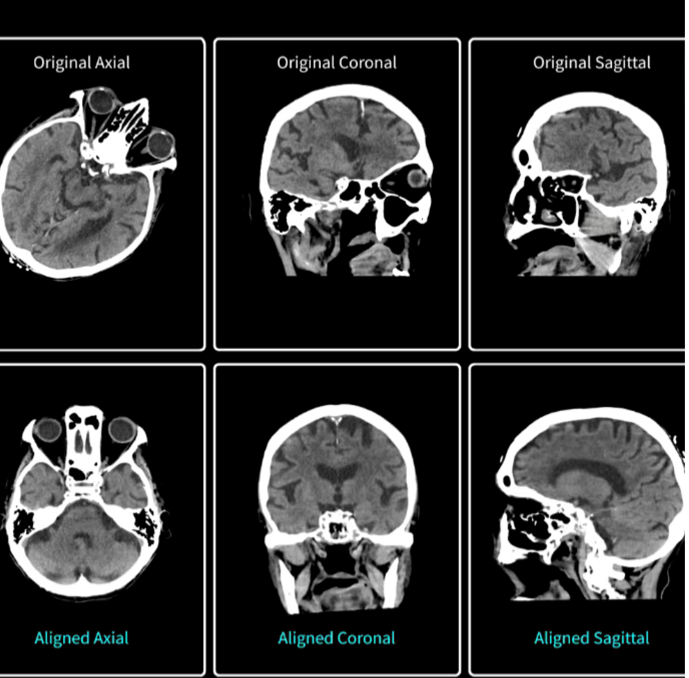 Post-processing a head CT traditionally involves rotating the image stack until the orbits, skull base, and foramen magnum align with canonical axial, coronal, and sagittal planes. This is a manual step that can add several minutes to a stroke or trauma workflow when time is critical. Head Auto-View automates the task by locating stable cranial landmarks and re-orienting the entire volume in roughly ten seconds.